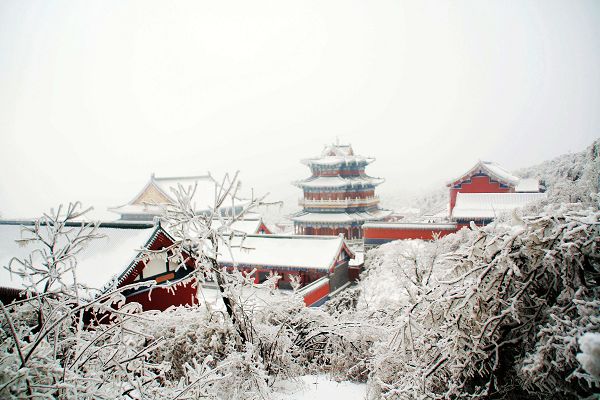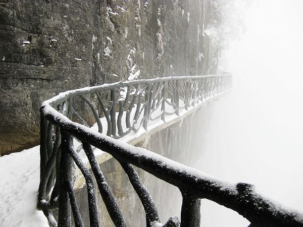順著路一直走走拍拍,連不愛(ài)照相的俺都忍不住吆喝著來(lái)一張來(lái)一張。俺兄弟一邊拍一邊不惜余力地打擊俺:您老就別糟踐這美景了。走在鬼谷棧道,一側(cè)是山壁,一側(cè)是霧氣籠罩的懸崖,后來(lái)又下起雪來(lái),真有點(diǎn)深山求仙的味道。其實(shí)一路走來(lái)并不累,就是總不得不從被冰掛壓倒的樹(shù)下鉆身而過(guò),累得腰酸。再有就是俺一度說(shuō)要雪盲了,眼睛都有點(diǎn)發(fā)花。最后終于到了頂端的天門(mén)山寺。確實(shí)要承認(rèn),在這樣的一番情景之下,佛性也顯得格外深沉,連那個(gè)向來(lái)不信的家伙也雙手合十。本來(lái)還想隨喜瞻仰一下佛祖真身舍利的,可被那個(gè)賣(mài)票的痞子樣給雷到而作罷。