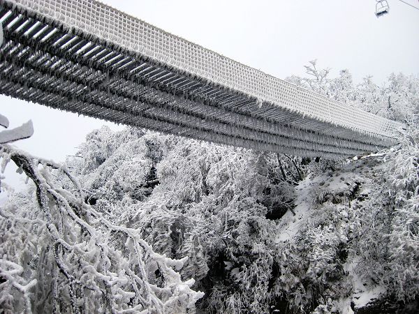 由于淡季,不用排隊(duì)很快坐上了索道,前前后后的轎廂內(nèi)都沒(méi)人,俺倆坐著好不優(yōu)哉。索道漸次翻越而后陡然爬升,進(jìn)入乳白色的氤氳之中,最后全被濃厚的霧氣包裹,像在云霧中漂移。俺又爽又驚,心想神仙還真不是好當(dāng)?shù)???粗懊娴牟僮髡f(shuō)明:沒(méi)事,這個(gè)挺先進(jìn)的,碰到惡劣天氣會(huì)自動(dòng)停止運(yùn)行。話音剛落,它就停了,然后左右左右的晃啊晃啊。俺顫顫地問(wèn):怕嗎?他說(shuō):嗯……還,還成。俺喃喃地道:靠,俺可不想死呢……終于正襟危坐地熬過(guò)了那幾分鐘的晃悠,繼續(xù)上行后,霧氣淡了許多,這才看到索道支架和輪軌竟然都凍上厚厚的冰掛。心肝一顫:不是吧,這是到哪了???!
