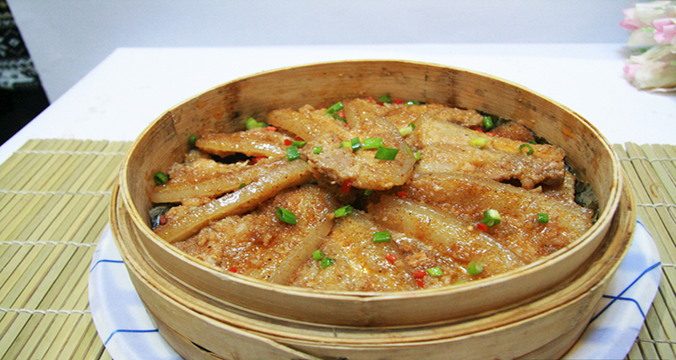 制作方法與我們平時家常菜粉蒸肉有些不同,更為復雜講究。采用合適比例的粳米和糯米,將辣椒、桂皮、八角、香葉等多種香料炒出濃郁的香氣,然后再磨成細粉,包裹在提前腌制好的肉片上,最后放入竹籠蒸制一小時。由于蒸制時間長,一部分油脂被釋放,成品軟糯潤滑油入口即化,醇香繞舌,完全沒有油膩的感覺。