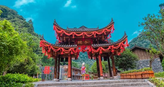 在風(fēng)景秀麗的湘西武陵源風(fēng)景區(qū)內(nèi),鑲嵌著一顆璀璨的明珠——德夯苗族村?!暗潞弧睘槊缯Z(yǔ),意為美麗的峽谷,距湘西自治州首府吉首市約24千米。這是一塊神奇的土地,這里溪流縱橫,峽谷深壑,瀑布飛瀉,落差達(dá)216米的流紗瀑布,如白練凌空,似銀紗懸壁。這里群峰競(jìng)秀,盤古峰海拔700多米,峰頂呈葫蘆狀,分大小兩峰,絕壁千仞,天險(xiǎn)難度,站立峰頂,方圓景色盡收眼底。這里有著名的公路奇觀,這便是湘川公路上最險(xiǎn)關(guān)卡——矮寨天險(xiǎn),從山麓到山頂全長(zhǎng)只有6千米,卻轉(zhuǎn)了13道彎,公路如白帶盤旋于青山之上,車行路上,伸手可抓到窗外白絮般的云霧。德夯距湘西自治州州府吉首市,屬省級(jí)風(fēng)景名勝區(qū)。這里山勢(shì)跌宕,絕壁高聳,峰林重疊,形成了許多斷崖、石壁、瀑布、原始森林。區(qū)內(nèi)溪河交錯(cuò),四季如春,氣候宜人,有豐富的動(dòng)、植物資源,自然風(fēng)光秀麗迷人。自矮寨鎮(zhèn)沿溪上行4公里至德夯苗寨,沿岸筒車、水輾、古渡、小舟,伴以苗家吊腳樓,一派田園詩(shī)情。九龍溪穿寨而過(guò),四周山色清幽,懸崖如削。過(guò)石拱橋可登盤古峰,峰高400余米,山巔有大、小兩峰,頂寬約5公頃多,為盤根錯(cuò)節(jié)的原始森林,四周絕壁,站立峰頂,方圓景色盡收眼底。