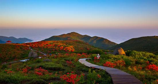 初春,大圍山萬(wàn)物復(fù)蘇,滿山翠綠、繁花似錦,可觀千畝櫻花、賞萬(wàn)畝杜鵑,游十里桃花,聞鳥(niǎo)語(yǔ)花香,聽(tīng)流水歡歌。盛夏,大圍山空氣清新,氣候宜人,這里年平均氣溫僅16.8°,是您感受激情漂流,品嘗甜美水果和休閑避暑勝地。金秋,佇立七星頂峰,極目遠(yuǎn)眺,群山莽莽、層林盡染,晨觀日出,晚賞落霞,高山壯麗景色盡收眼底,使人心曠神怡,豪情滿懷。嚴(yán)冬,大圍山漫山玉樹(shù)瓊枝、銀妝素裹,霧淞冰掛,美不勝收,使人恍若進(jìn)入到童話般的世界。